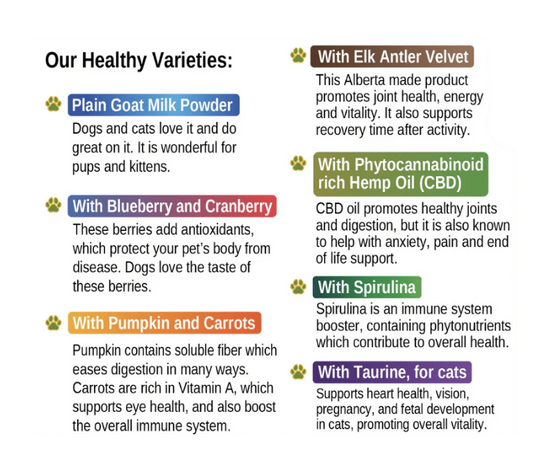 Goat Milk: is easy to digest, supports the immune system, skin , coat and can relief allergies, contains prebiotics, which are necessary for the probiotics to be effective.