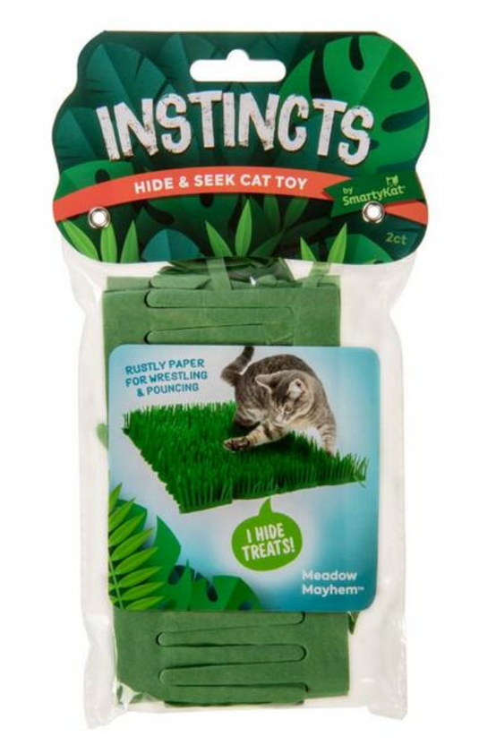 Instincts by SmartyKat® Meadow Mayhem™ Set of 2 expandable faux grass mats release your cat’s inner instincts by simulating an outdoor hunt in the grass. Hide treats, catnip, and small toys for a more exciting and mentally stimulating hunting game. Bring the outdoors safely and conveniently indoors for your natural-born hunters.