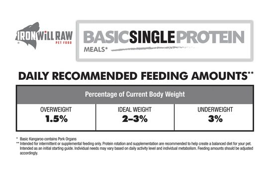 Intended for intermittent or supplemental feeding only. Protein rotation and supplementation are recommended to help create a balanced diet for your pet. Contact Iron Will Raw or a veterinarian for puppy or kitten feeding guidelines.