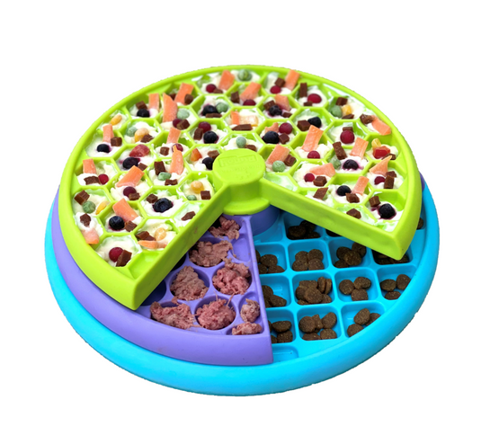 Lickin' Layers is a Level 2 dog puzzle game from Nina Ottosson by Outward Hound. Increase the challenge by freezing Lickin' Layers with natural yogurt and some tasty treats or peanut butter (sugar and xylitol-free)!