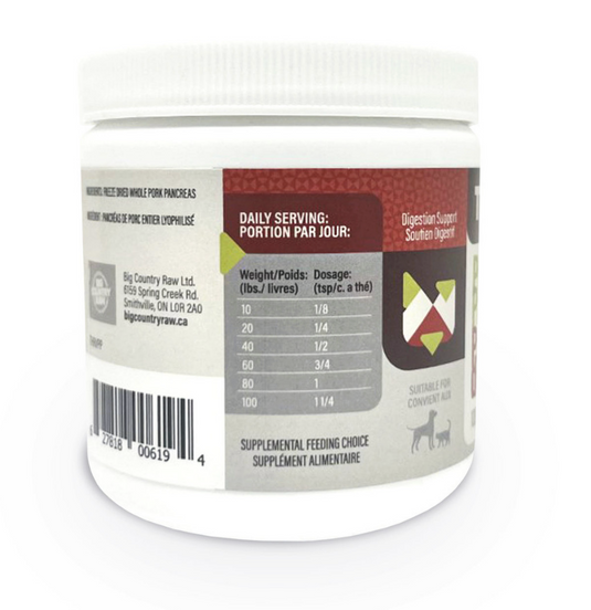 Recommended Daily Dosage: 1/4 tsp per 20 lb. body weight split between meals. 1.2g / tsp. Can be adjust with veterinarian recommendation based on enzymes requirements.