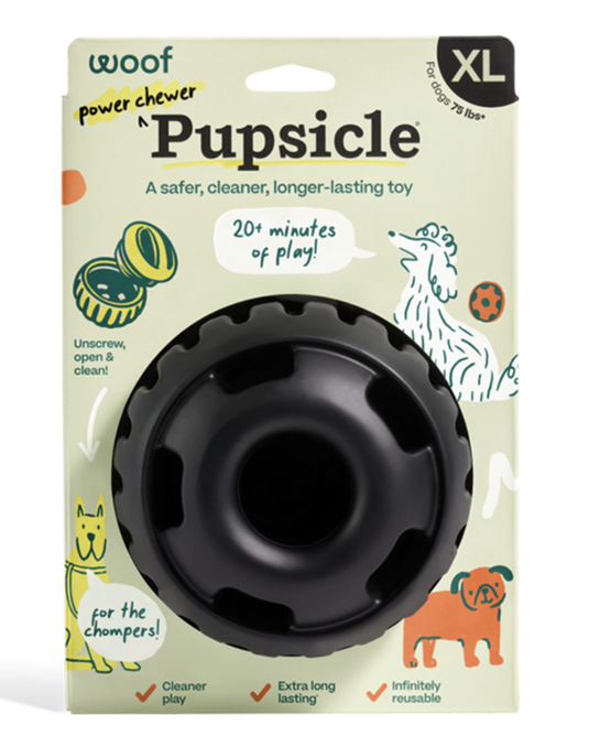 The Pupsicle is a new breed of dog toy: the cleanest, safest & longest lasting enrichment toy on the market. It unscrews to open so it’s a breeze to fill & clean - plus customers can make their own refills with healthy ingredients that dogs love! Simply fill the Pupsicle with our pre-made Pops or use our companion Treat Tray to create the frozen treat of your choice. Peanut butter, canned wet food, yogurt, fruit, and bone broth are just a few of the freezable fillings you can use.