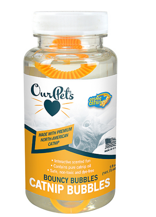 Cosmic Bouncy Catnip Bubbles contain pure catnip oil for interactive, scented fun. Bubbles are safe, non-toxic and dye free.