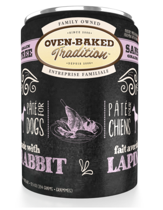 Canadian Brand. Oven-Baked Tradition Rabbit formula for Dogs is a fresh and authentic paté canned food. With rabbit meat as the first ingredient, this homemade recipe is prepared in smaller portio...